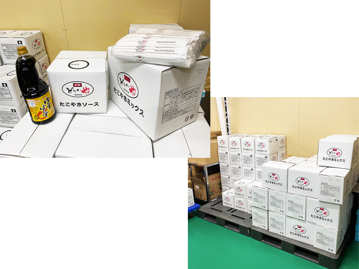 たこ焼きに必要な粉やソース、ポン酢にタコ、備品の箸など、どないやオリジナルブランドとして、FC店舗様にご提供させていただきます。